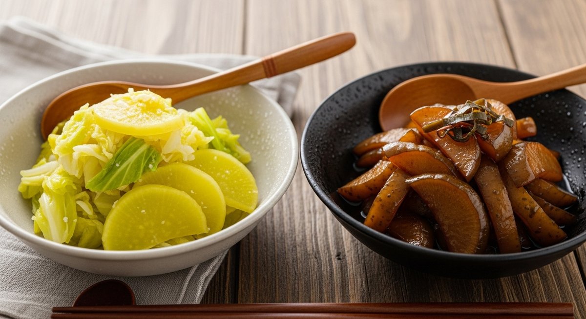 手順は材料を切って塩で揉み、水分を絞ってから容器で漬ける流れが標準で、保存も長く効くよう工夫されています。季節の収穫物を長く楽しむ文化が反映された漬物です。
